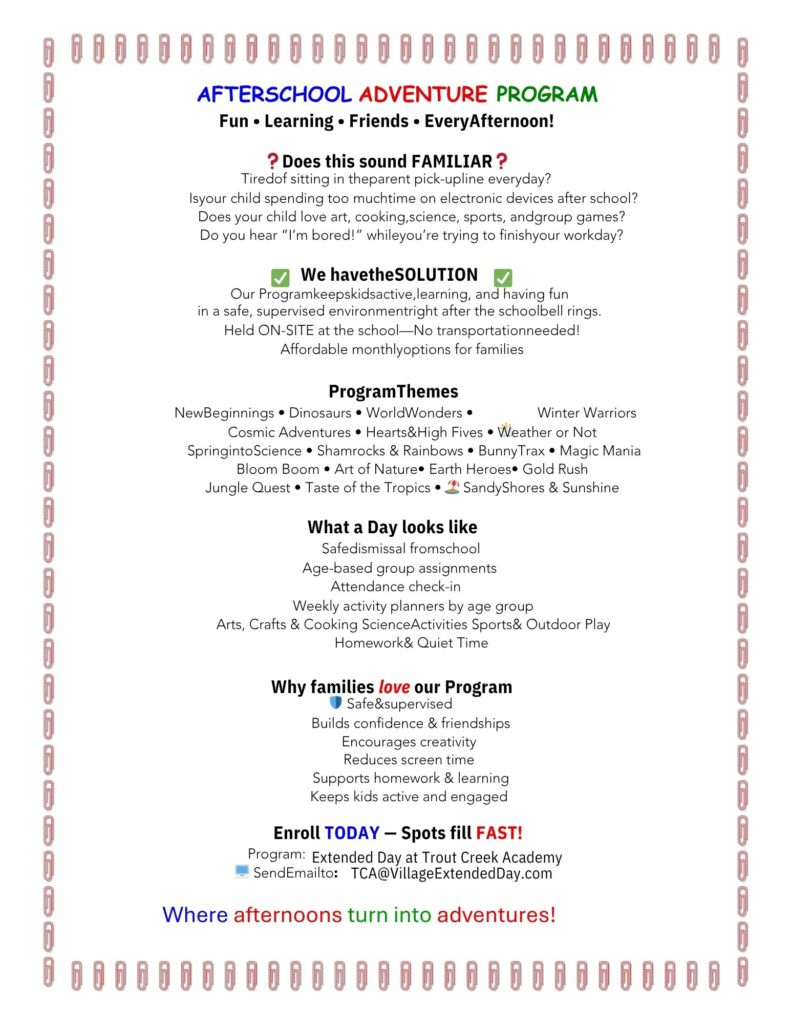 Extended Day at TCA TCA Student Enrollment Form – Trout Creek Academy Extended Day TCA Extended Day – Parent HandbookFor additional information, please email: [email protected]